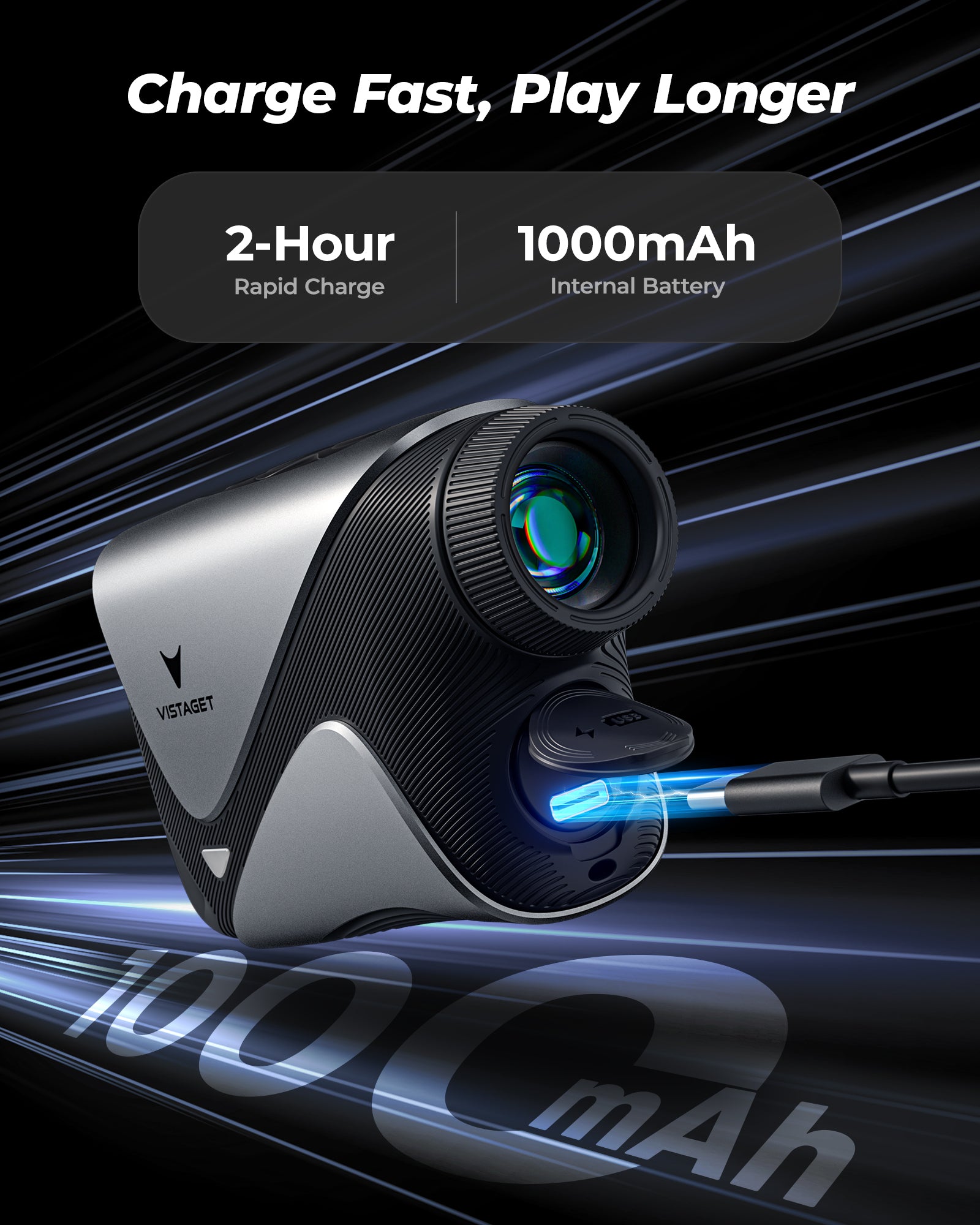 - [USB-C Charge – Long-Lasting Battery] Rechargeable golf rangefinder with a 1000mAh battery and USB-C port. Provides 9+ hours of use on a single charge (may vary), eliminating battery swaps for uninterrupted play